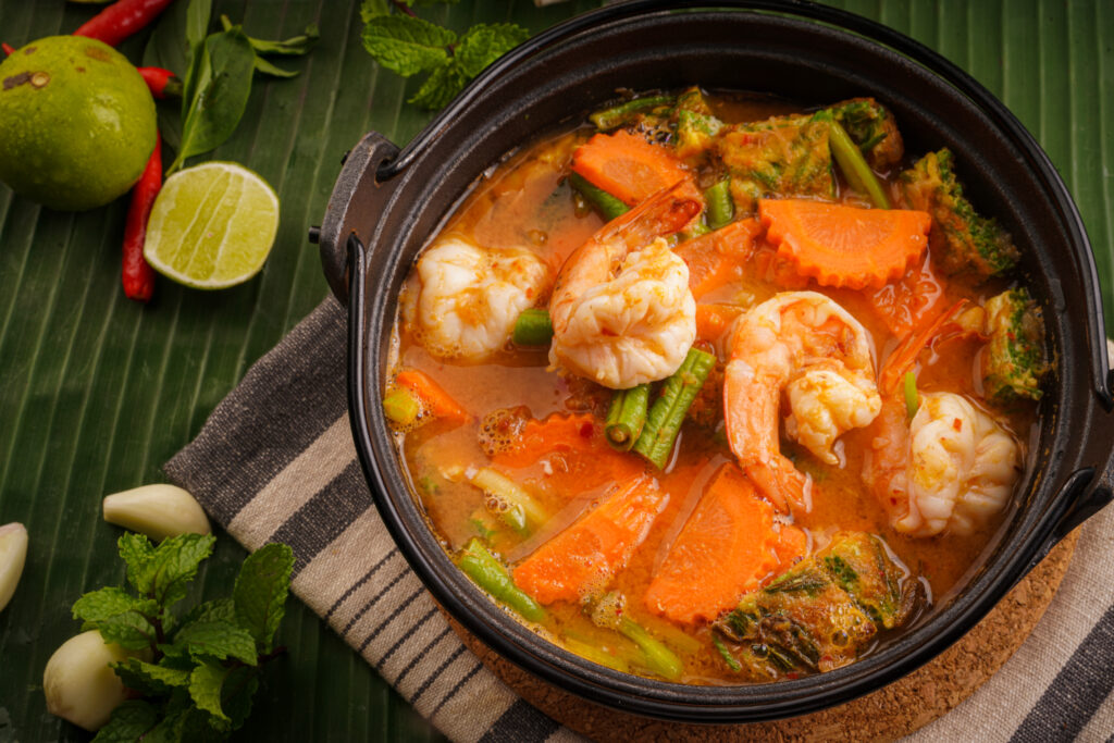 Zuur & pittige soep, baby mais, wortel, bloemkool, bonen