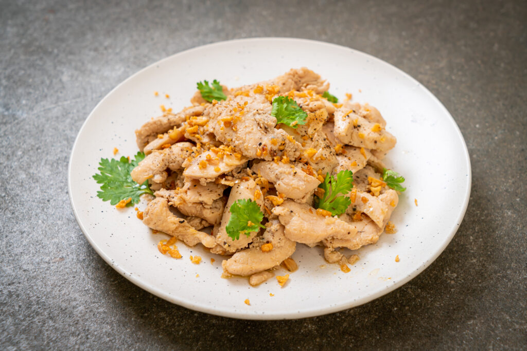 Zwarte peper, knoflook, geserveerd met gebakken groenten
