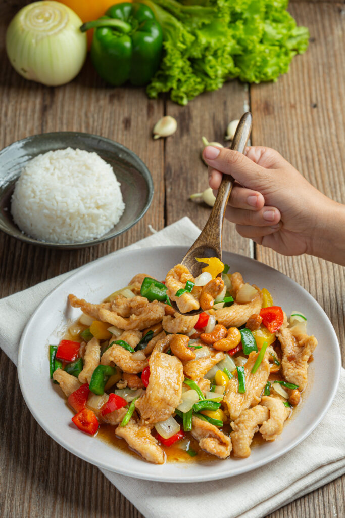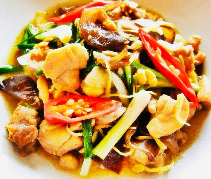 Paneng saus, kokosmelk, pinda’s, sperziebonen, limoenblaadjes