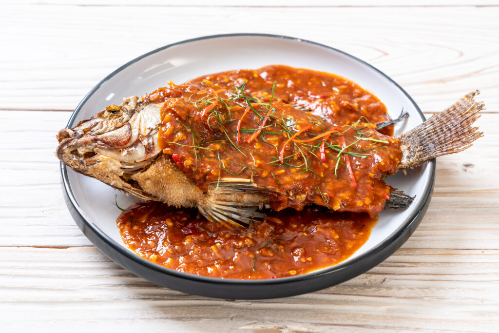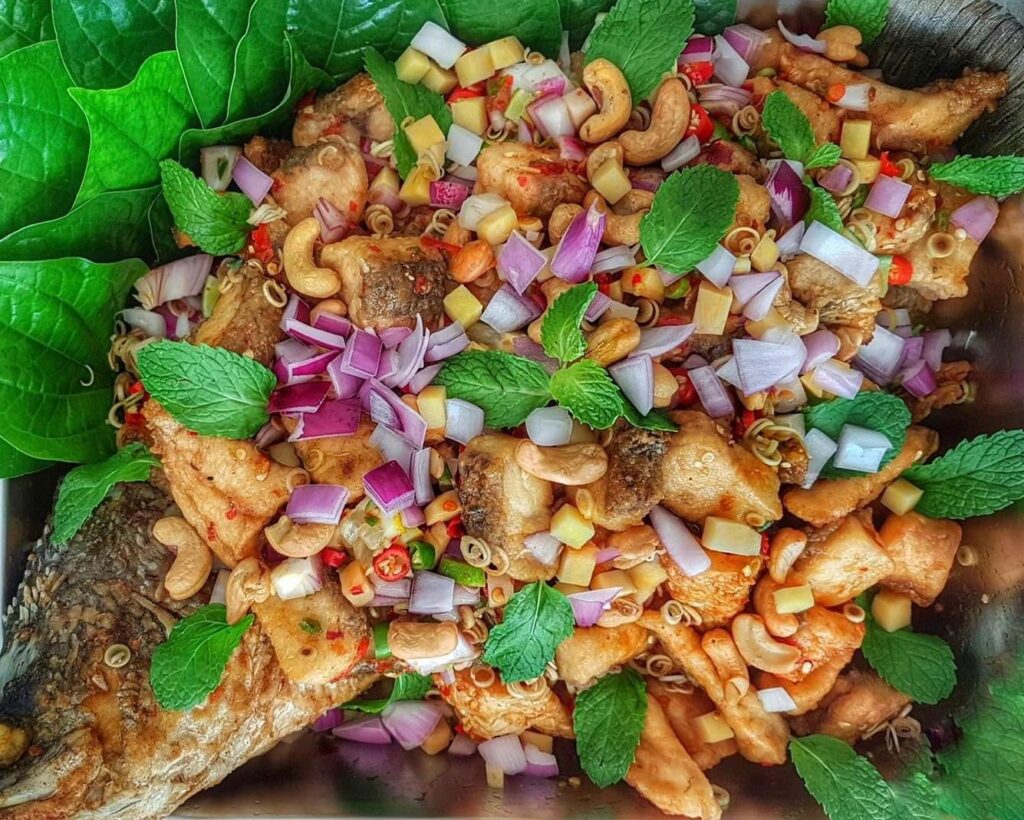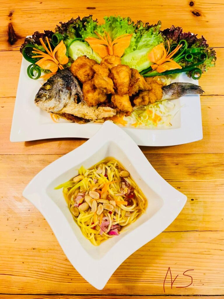 Geserveerd met sla, pikante saus, Thaise kruiden