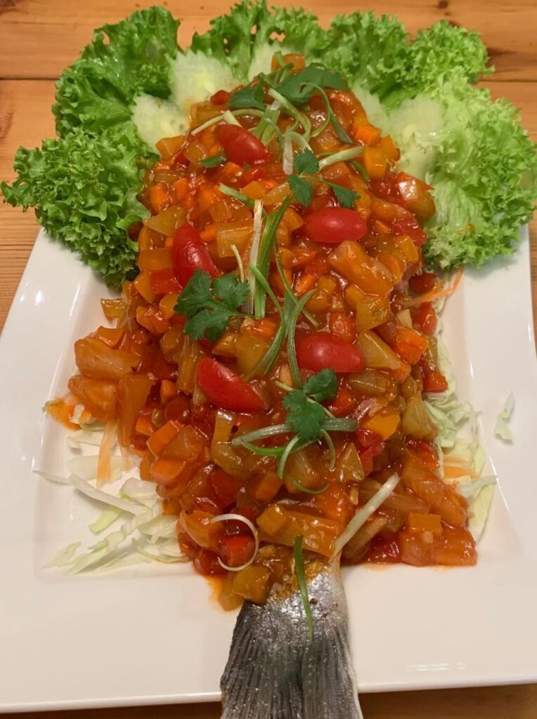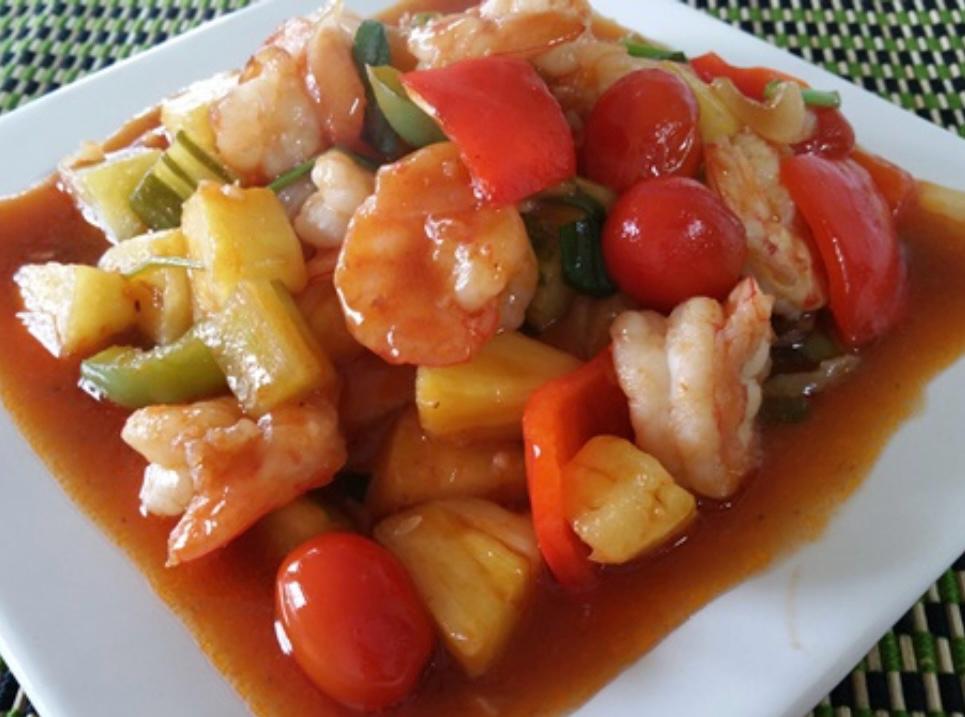 Zoetzure saus, ananas, paprika, tomaten, ui, bosui, komkommer