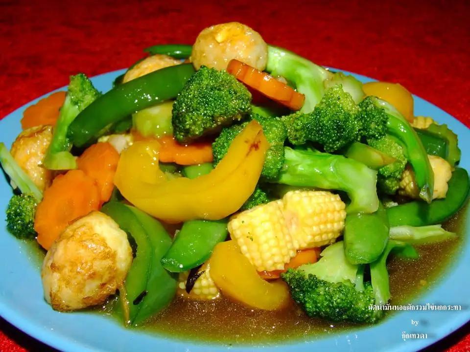 Oestersaus, wortel, broccoli, sugarsnaps, champignons, courgette