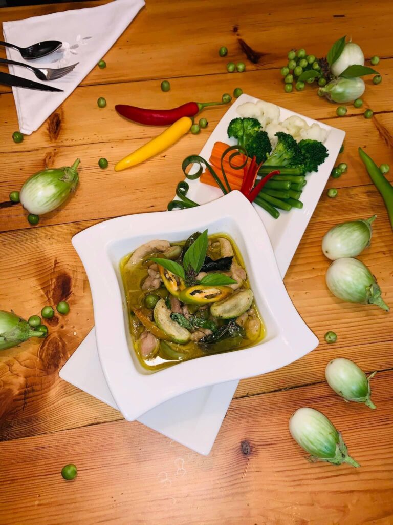 Groene curry, kokosmelk, courgette, sperziebonen, basilicum, pompoen, rode en groene peper